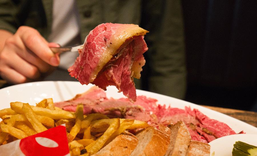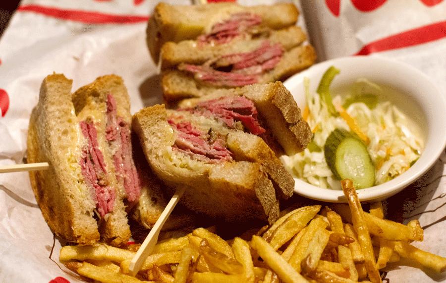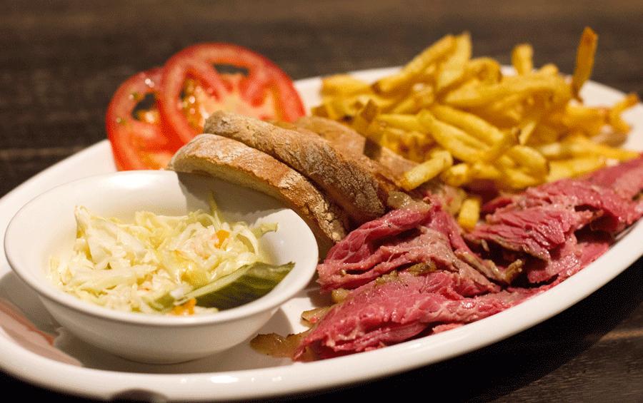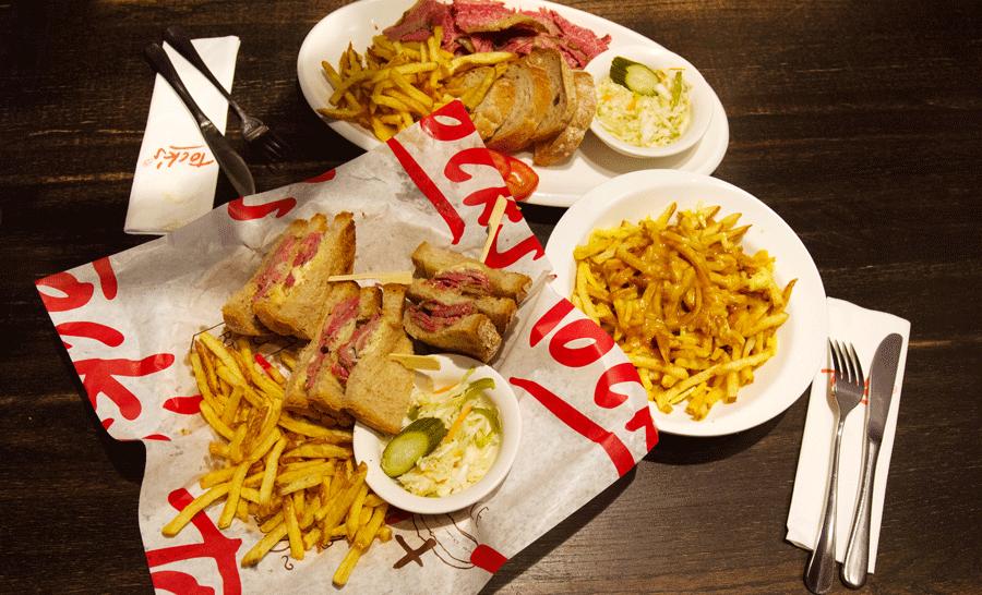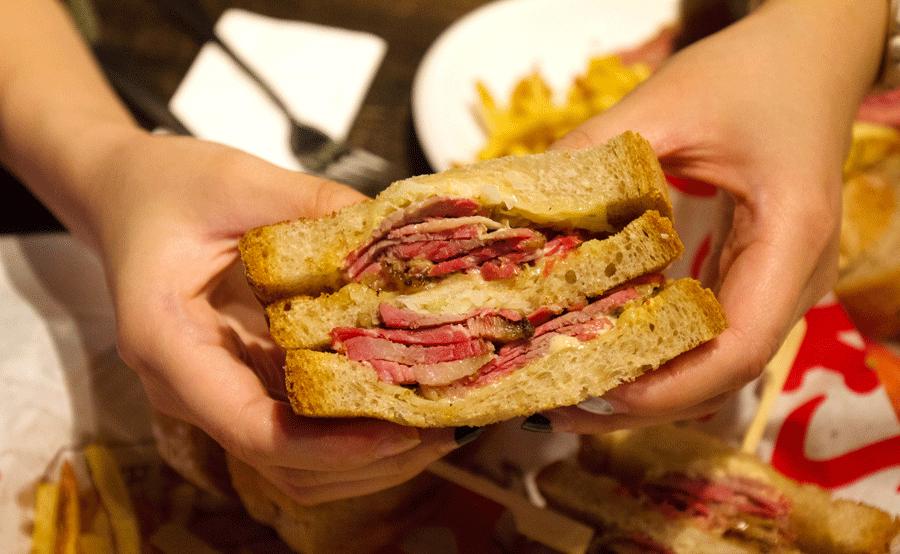这家店的主打是蒙特利尔熏牛肉,每次来,店员就会端来一个小盘子,上面放着几片熏牛肉供顾客试吃品尝。酸菜牛肉三明治可是这里的招牌了,三明治有大份中分可以选择,分量都大的吓人,如果你是一个姑娘家家肯定是吃不掉的,建议和朋友share。