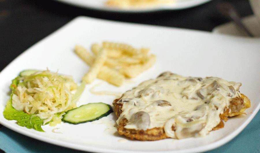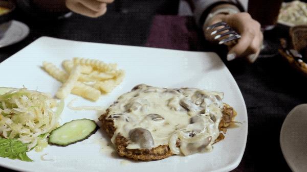 看不出这道菜竟然是牛排吧?牛排上被裹着浓浓的口蘑酱,肉虽然是全熟,但是非常嫩。有奶油和蘑菇的经典搭配作为陪衬,给肉质普通的牛排增色了不少。