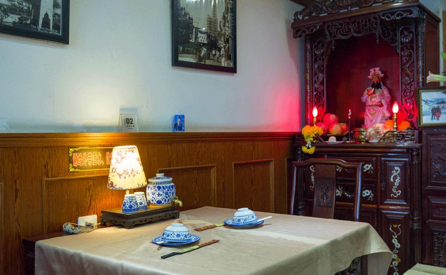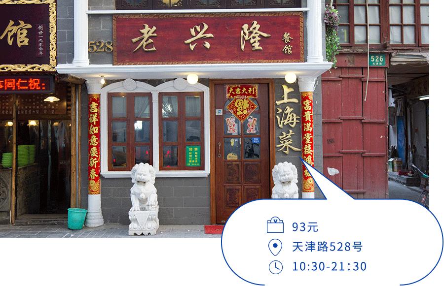 在天津路的另一边,小马路上这家店特别显眼。小小一家店,却两只石狮子坐正门口,威风极了,白色柱子、雕花木门上贴着对联和福字,有一种幽默的威严。“上海菜”三个大字树立在门口,没错,这是一家典型的上海风格小饭店。