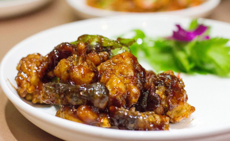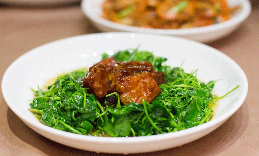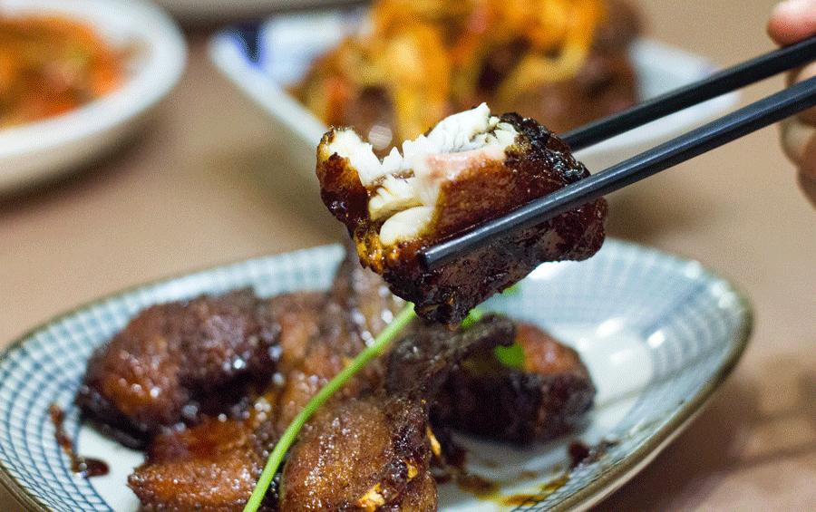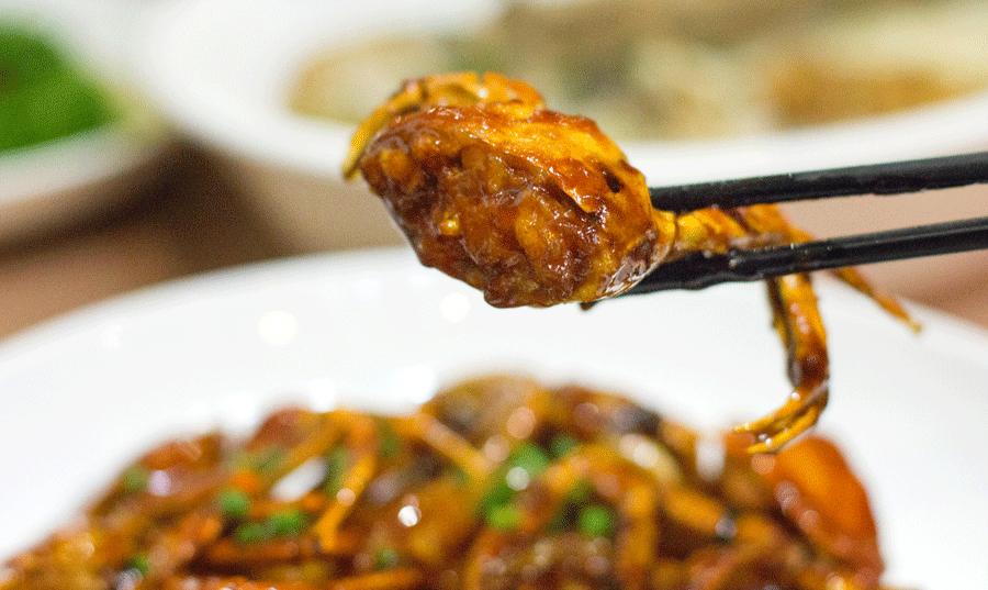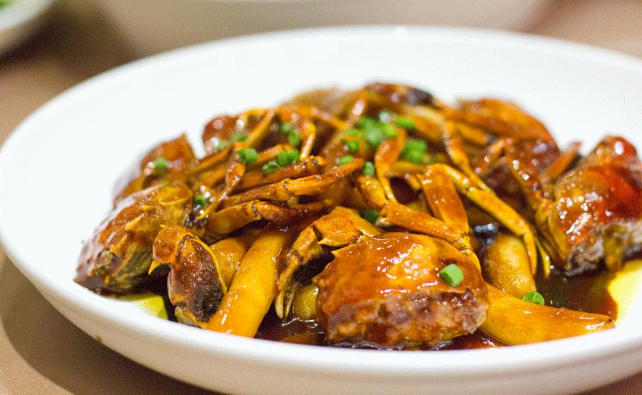 又是一道浓油赤酱的典型上海菜,这个季节的毛蟹个头挺大,个个都很饱满,其中有些还带有蟹黄。