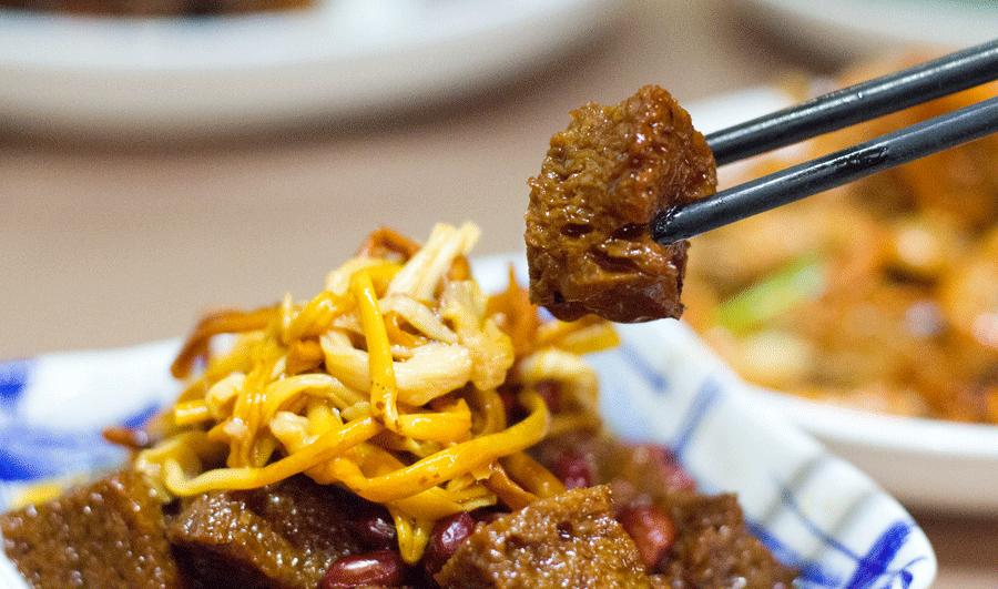 夹起一块烤麸,一口咬下去,酱汁从气孔中爆出来,喂,这道菜不叫金针烤麸吧,应该叫“爆浆烤麸”才对,不知道老板用了什么配方,酱汁特别浓郁,烤麸吸收了酱汁也很松软(最怕那种发僵掉的烤麸了)。可以说,这碟是局座吃了三十几年的烤麸,最完美的之一。别拦我,这盘烤麸局座承包了。