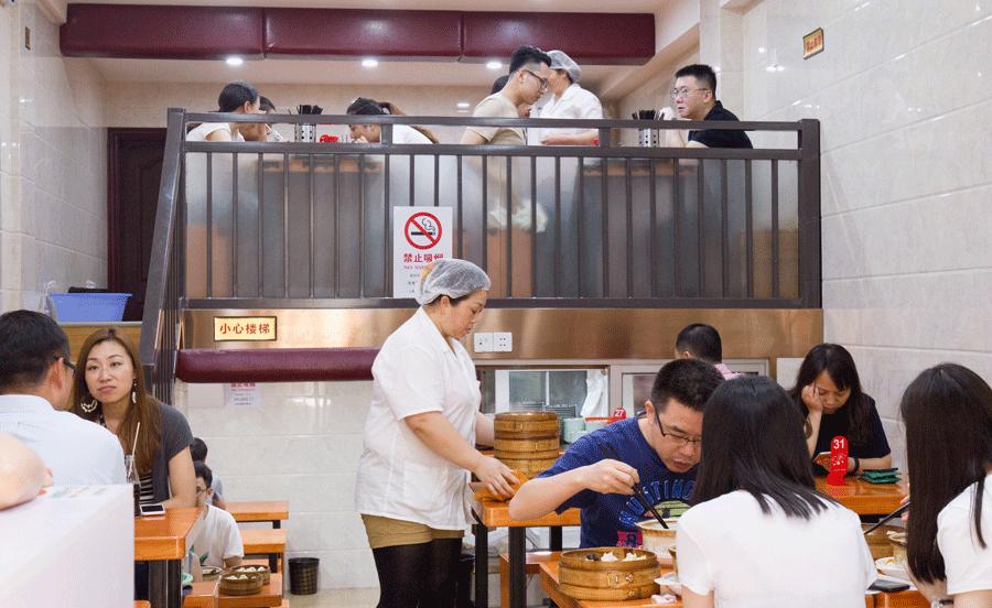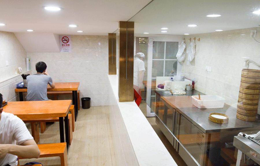 二层居然还有透明式的厨房设计。透过玻璃看到厨房也是整洁干净,井井有条的,才算放心了。里头包小笼的阿姨们手法熟练,从擀皮到包馅一气呵成,没有丝毫犹豫,专业。