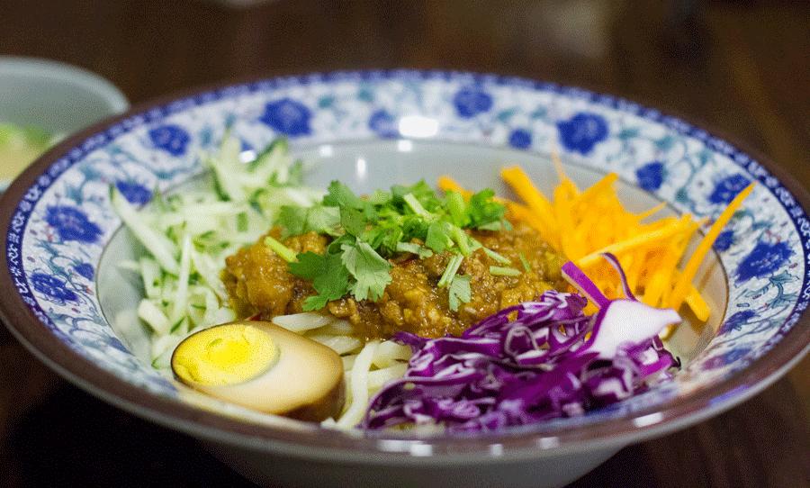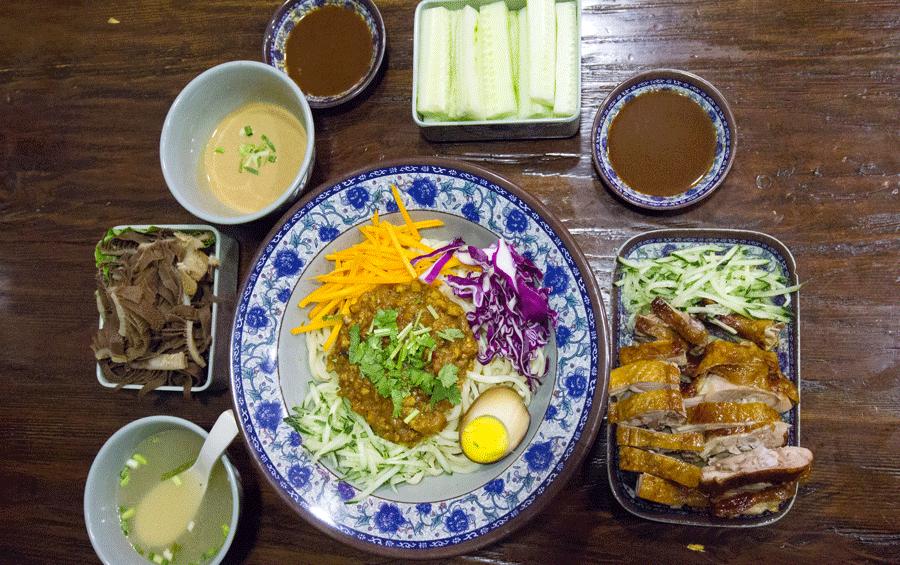 色彩搭配鲜艳,黄瓜丝,胡萝卜丝,紫甘蓝丝、卤蛋有序的摆放在一起,黄豆酱和甜面酱混合的炸酱是老北京的味道。酱炸的很透,肉糜起壳,微硬,嚼着很香。面条是手工面,十分筋斗,和炸酱拌在一起刚刚好,面条上挂着酱汁和肉糜,看着就让人垂涎欲滴。
