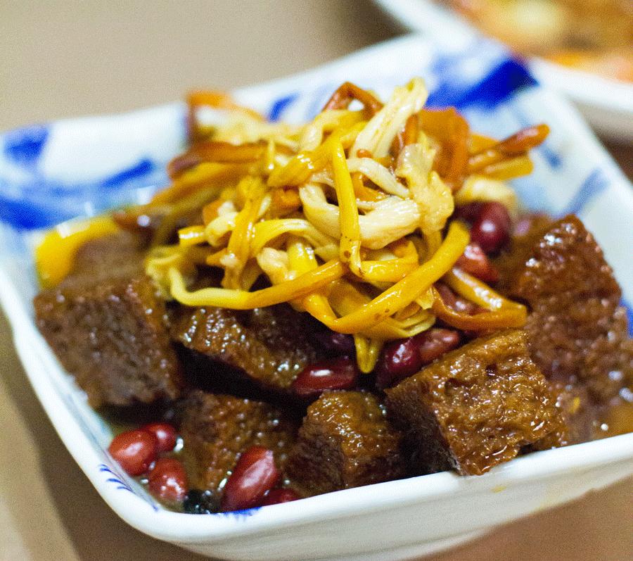 烤麸是一道很经典的上海本帮冷菜,但说老实话,上海滩局座能看上的烤麸并不多。这家送上来小小的一碟,精致小巧,黄油油的金针菜下面铺着一块块褐色的烤麸,中间还藏着些许花生米作为点缀。
