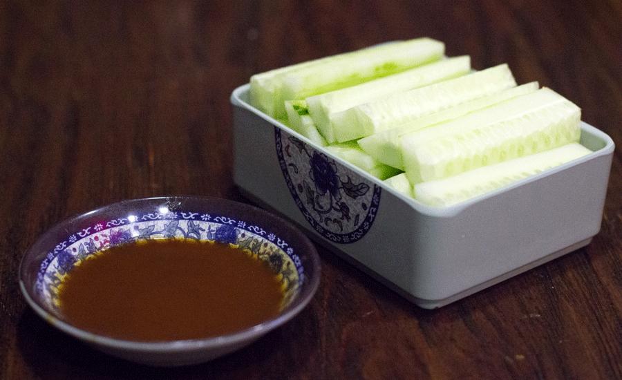 肉啊面啊吃多了,来一盘黄瓜正好能消除油腻感,店家用心的把黄瓜皮都去掉了,少了扎舌头的感觉,只剩黄瓜最嫩的内芯,蘸一口自制甜面酱,没有比这更加清爽了。