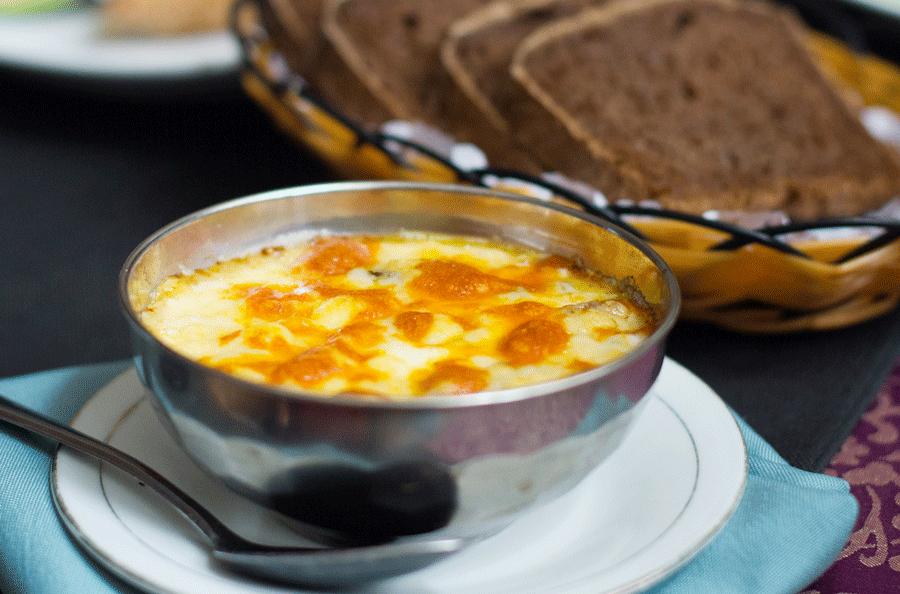 焖牛舌看起来更像是焗牛啥,虽然看上去小小一份,但奶味十足。刚端上桌的时候表皮微焦冒着热气,藏在里面的牛舌被切成一小块一小块的,嫩得出奇,芝士奶酪牛舌搭配的恰到好处。局座喜欢用黑面包蘸着吃,十分解腻。