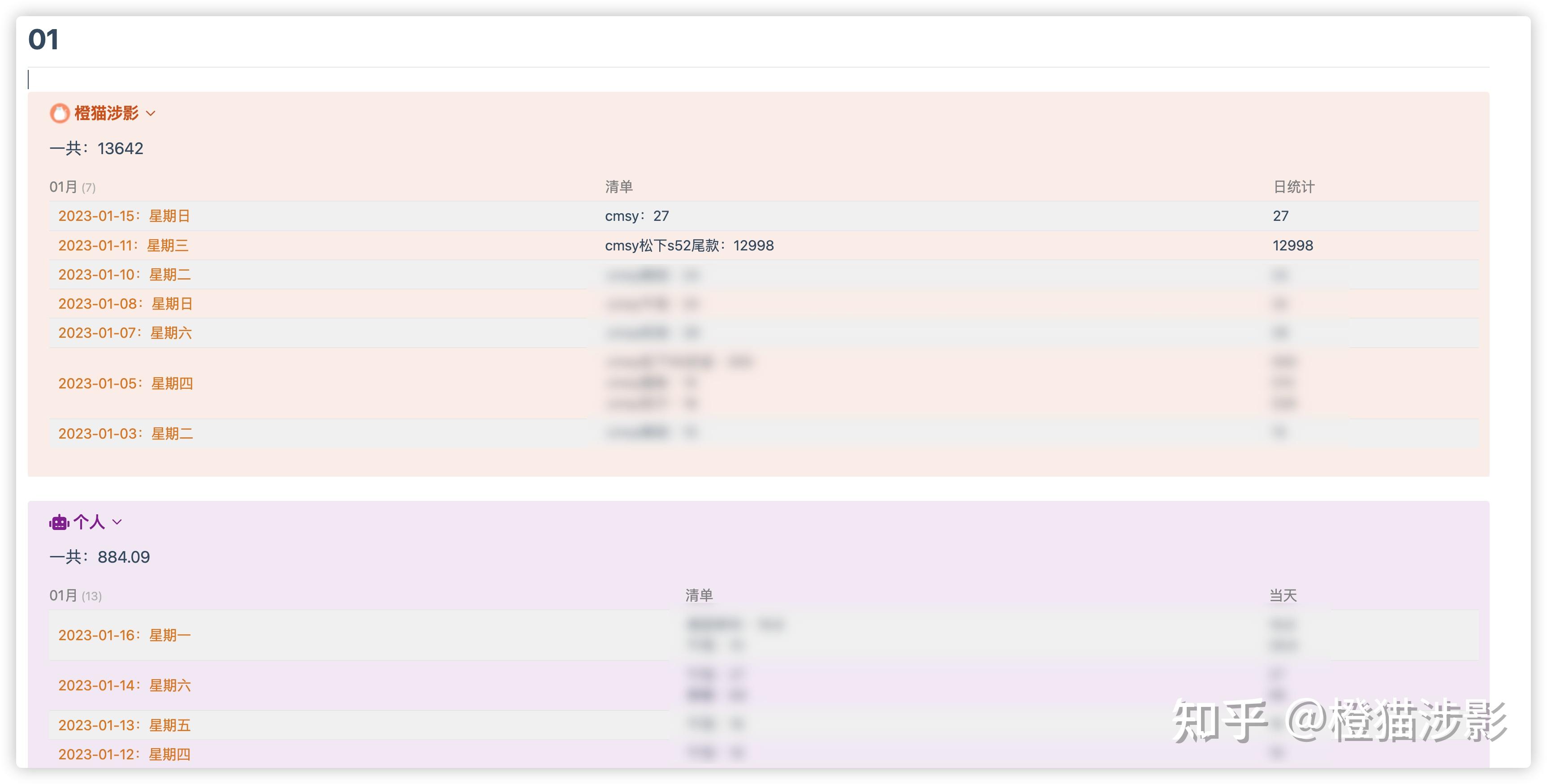 Dataview 再搭配插件 admonition 的美化效果,让界面看起来更舒服。 "记账.md"中对 2023 年 1 月的记账 Admonition+Dataviewjs 最终效果如下: