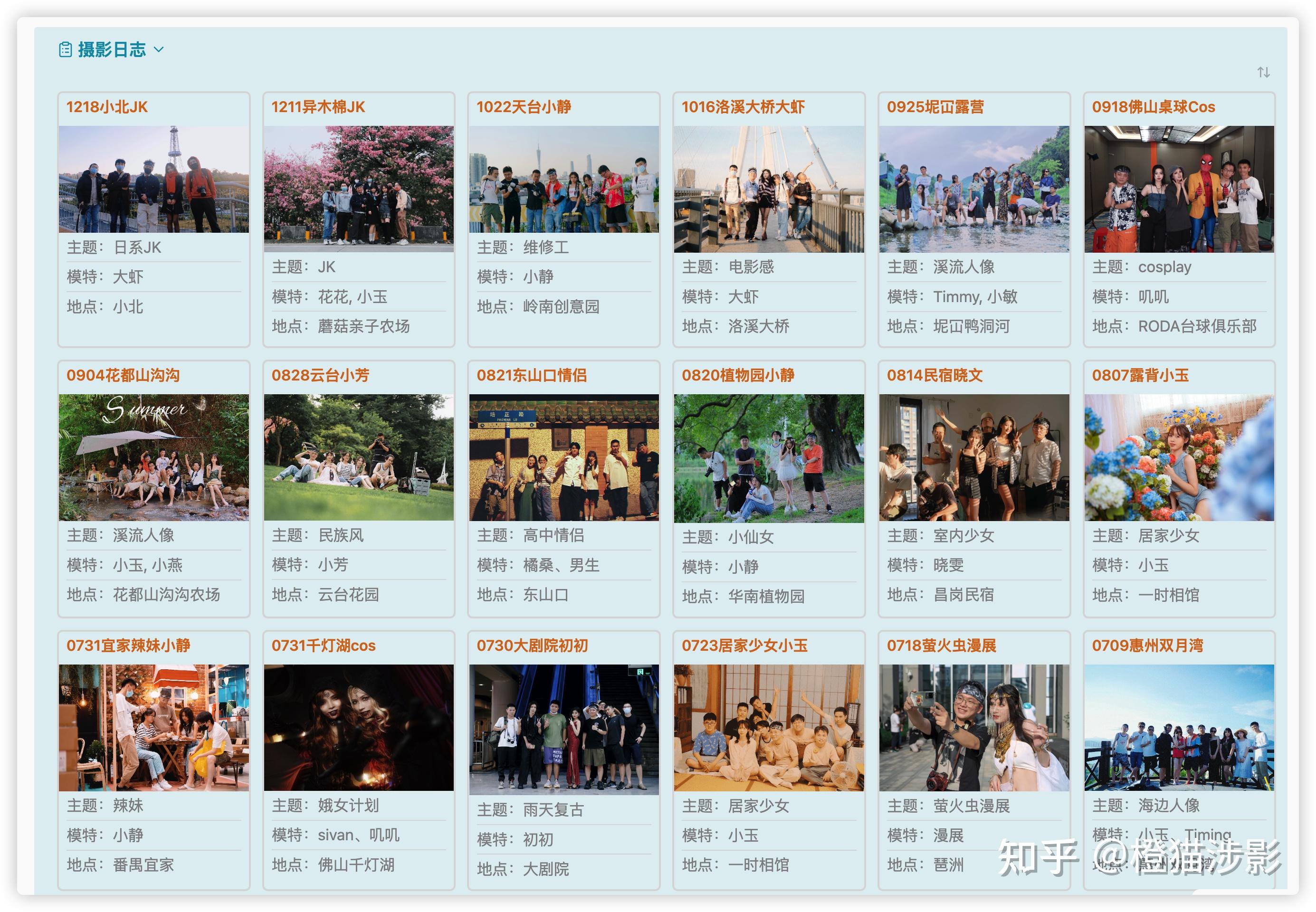 这个功能是我使用频率最高的。还用在了看过的书、组织的拍摄、产出的视频、衣柜衣服、模特档案、摄影器材库等等,有收集水浒卡的感觉。我一直坚持记录了 2022 年的每一场拍摄,最大的感受就是,「我的记忆不需要记忆了」。