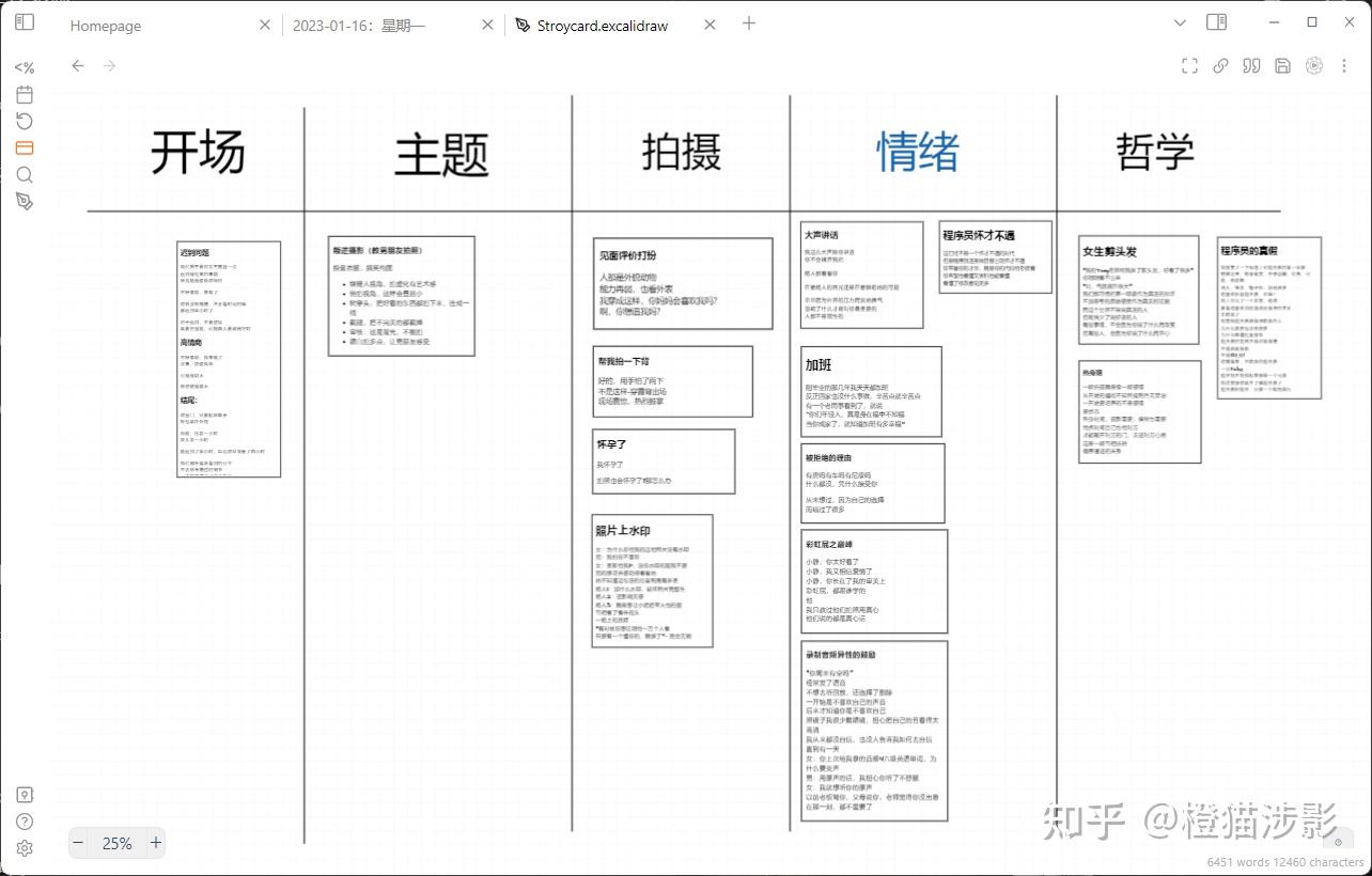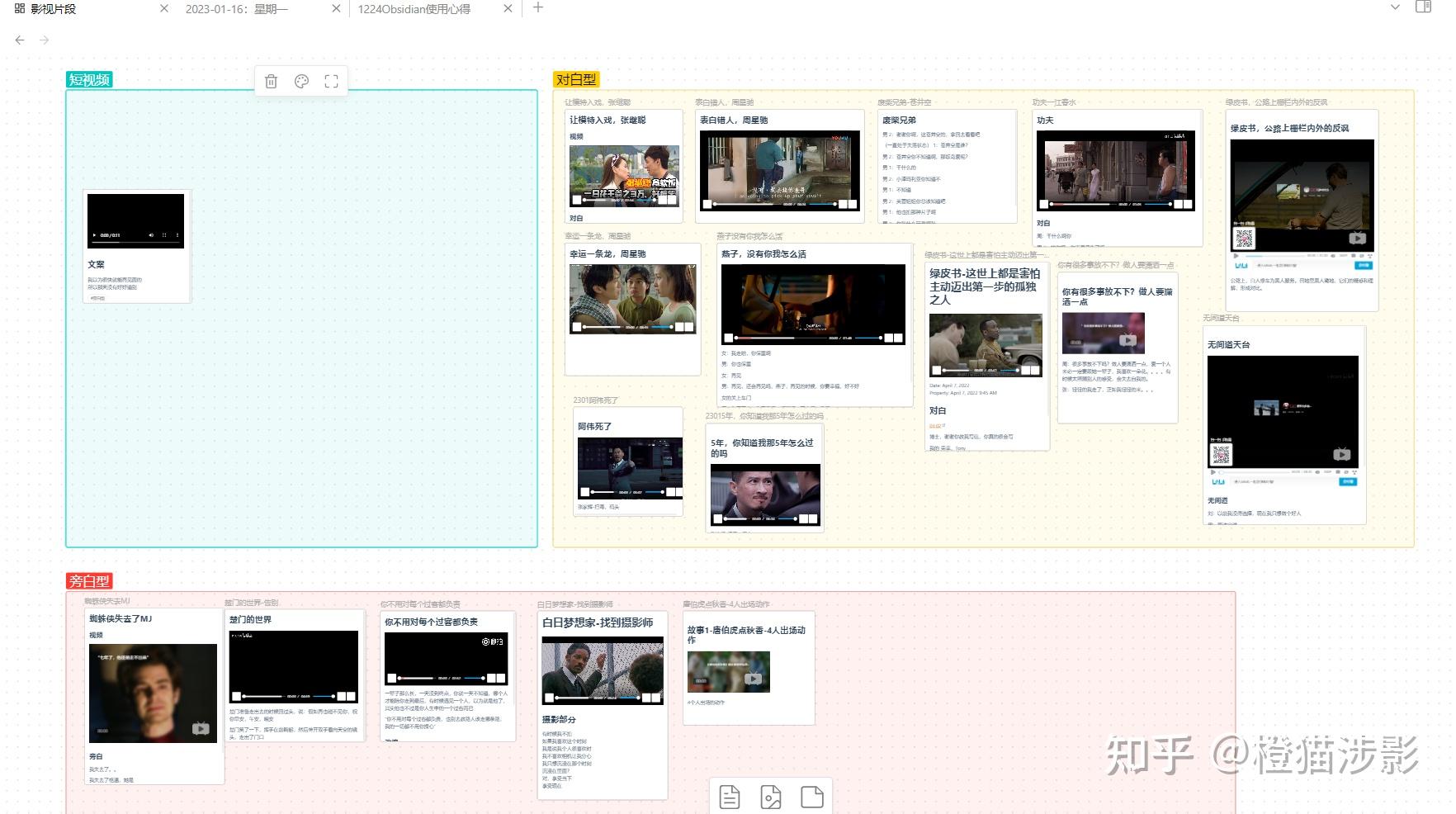 后来调整视频方向,用卡片的方式设计短剧情,有的可能只有一句话,最长的就一段话,有的是影视视频的 cut 剪辑。当我去找合适的桥段,要一个个去点击查看,很局限,看不到全局,没了「大局观」,做不到合理挑选。插件 Excalidraw 完美解决了这个问题。每一个卡片都是本地 MD 文件,全平台,工具免费,夫复何求!