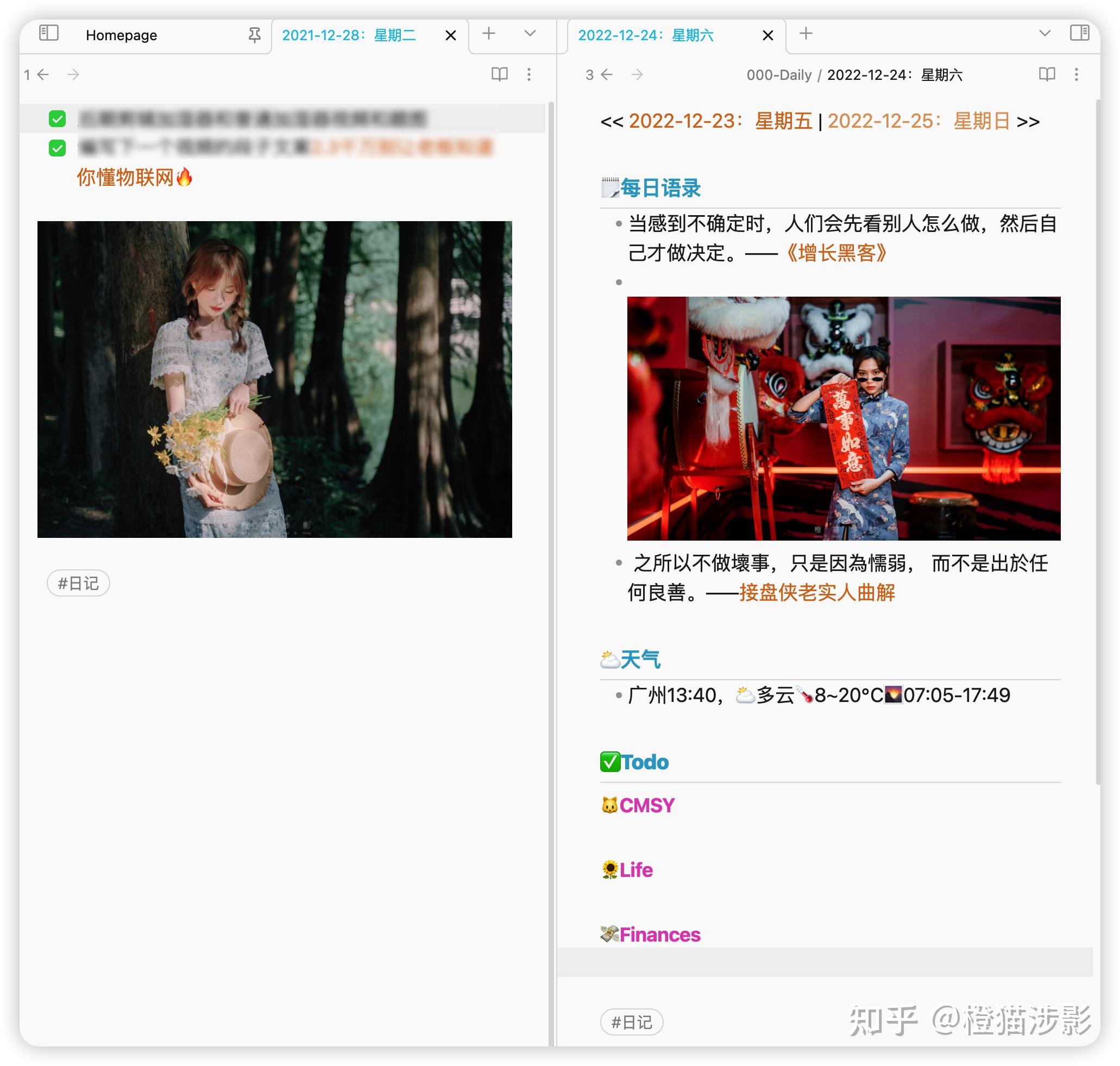 所有的事情加在一起,数量越来越多,复杂度也越来越高,以至于无法回顾总结等等,甚至别的事情都没有精力和时间去处理。早在 2 年前印象笔记满足不了需求,但又没意识到「人是会被软件卡脖子的」,毕竟常用的 Keil、IAR、Ps、Lr 都是几十年如一日。2021 年底,阴差阳错接触到笔记软件,了解到有更新换代的说法,马上把推荐的 Obsidian、Notion、语雀、logseq、wolai 等,都用了一遍。最早偏爱 Notion,因网络原因放弃而转向本地的笔记软件,选择了热度最高的 Obsidian。随着深入使用,发现这次是遇到了真爱。第一爱好编程,第二爱好摄影,Obsidian 居然能让它们结合起来,一款能编程自动化、带插件系统、全平台免费的笔记软件!