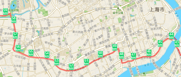 斜土路骑行一段后自然过渡到南丹路,比斜土路略窄,但路况较好。到达番禺路(上图53KM处)后,请向北转到虹桥路。虹桥路是一条神奇的东南到西北的干道,具有独立的非机动车道,且红绿灯不多。可直插长宁古北核心区域。