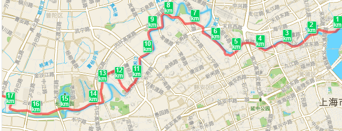 此路线西起普陀长宁东至外滩,几乎横贯了上海市区。上海的苏州河已经从臭水变成了城市景观,几年前开始我就一直在苏州河沿岸跑步,按照上图的东~西的顺序我来简单说明一下。