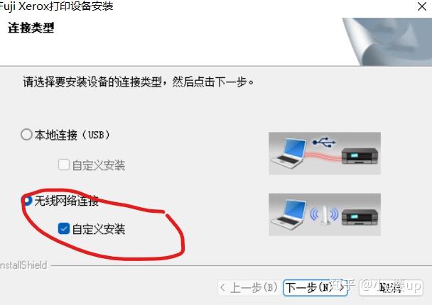 3、由于我们的需求是无线连接,因此我们选择“无线网络连接”,并勾选“自定义安装”,点击“下一步”。