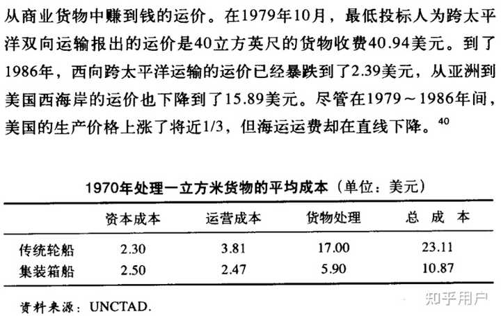 1970年,集装箱运输刚刚起步时,货运成本已经不到传统轮船的50%,一立方米的平均成本是10.87美元,到1979年,一立方米的货运费用已经降到4美元,到1986年,运价又跌至1.5美元。