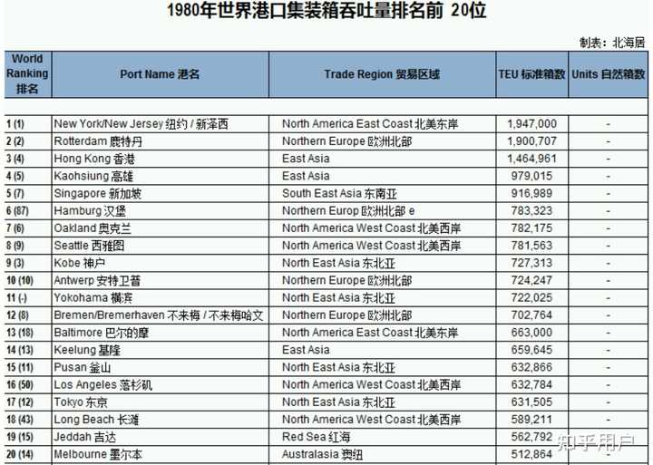 1980年全球20大集装箱港口有8个位于东亚