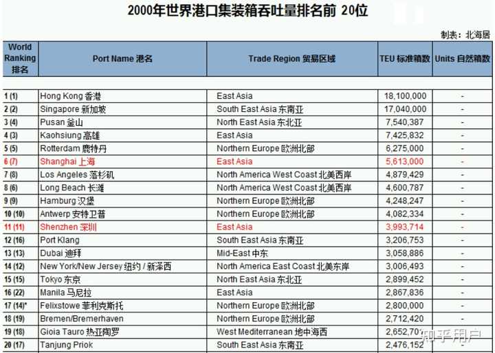 2000年全球20大集装箱港口有10个位于东亚