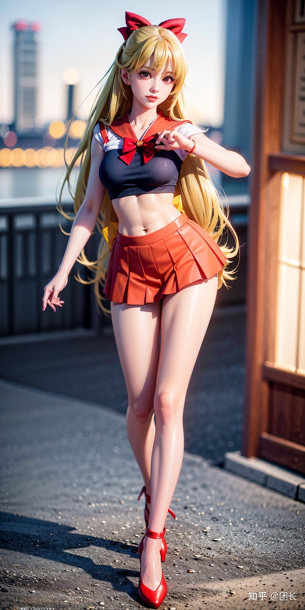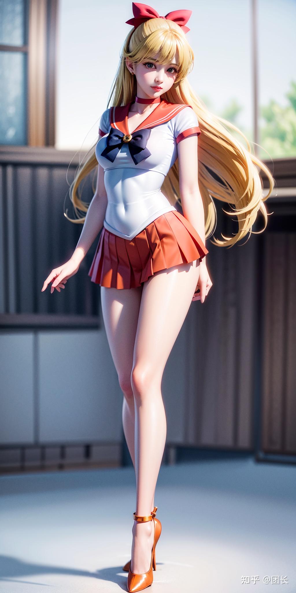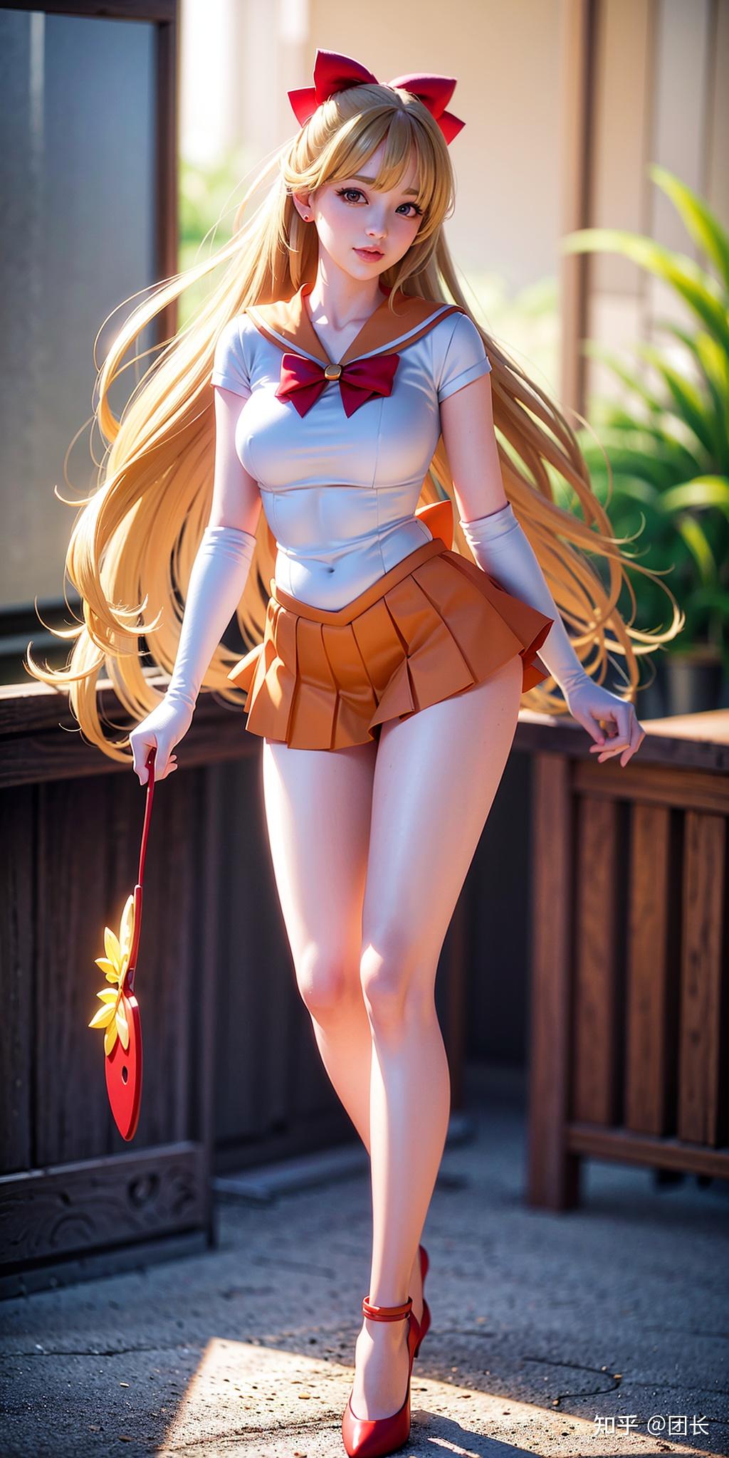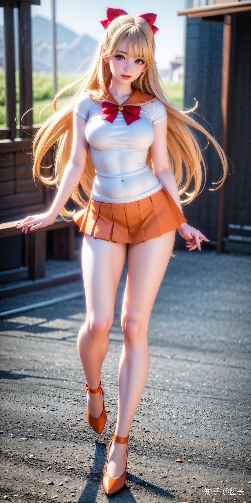 full body, red shoes, venus1, 1girl, solo, sailor senshi uniform, blonde hair, magical girl, blue eyes, orange skirt, elbow gloves, tiara, pleated skirt, hair bow, orange sailor collar, miniskirt, red bow, orange choker, white gloves, very long hair, jewelry, earrings, smile, unparalleled masterpiece, ultra realistic 8k CG, perfect artwork, ((perfect female figure)), narrow waist, chinese deity, looking at viewer, seductive posture, sexy pose, clean, beautiful face, pure face, pale skin, divine goddess, shiny skin, skindentation, glint lora:sailorVenusSailor\_v10:0.7, ulzzang-6500-v1.1, Show belly button lora:chilloutmixss20\_v20:0.3, (8k, RAW photo, best quality, masterpiece:1.2), (realistic, photo-realistic:1.37), ultra-detailed, (long legs:1.3),