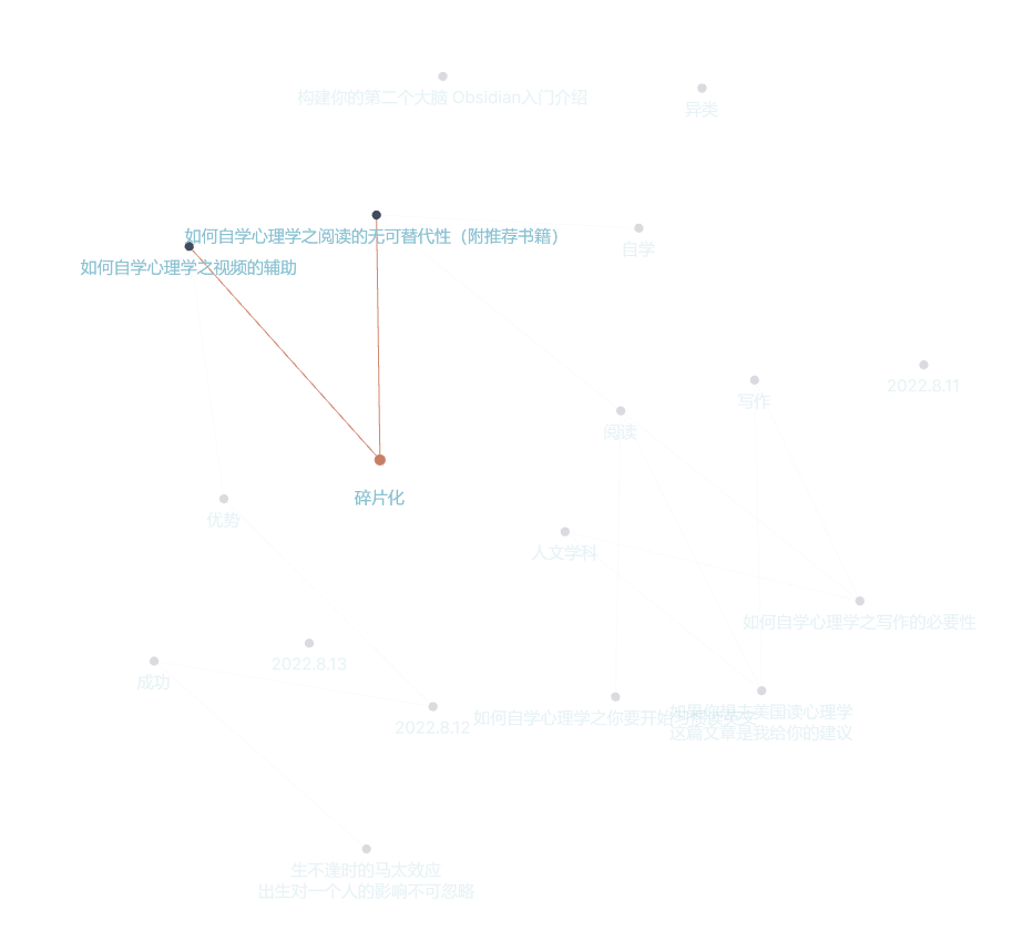 这个是我创建的关系图谱,可以看到看似毫无关联的文章用双向链接进行了连接。当我把鼠标放在“碎片化”这个点的时候,发现它连接了两篇文章,这样的灵感串联着实解决了文章之间没有互动的这一点。