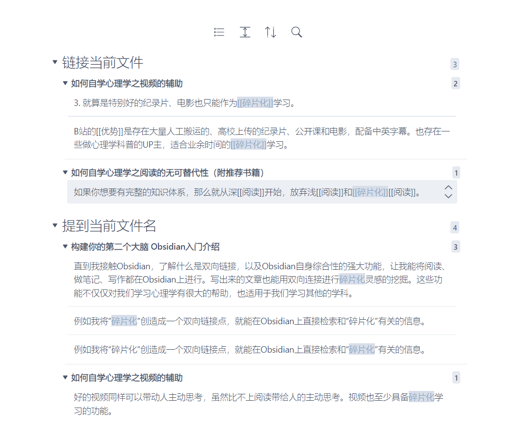 "链接当前文件"是我已经将其链接的内容,可以看到在我的两篇文章中都提到了“碎片化”。“提到当前文件名”是我还未进行链接的内容,如果我认为这里提到的“碎片化”对知识体系的搭建有所帮助,那么我也可以将其链接。