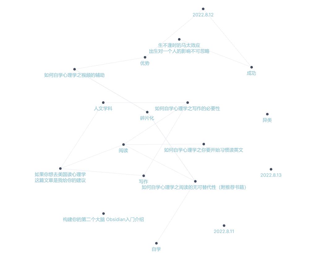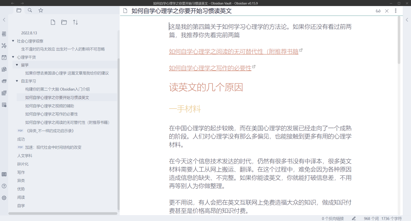 直到我接触 Obsidian,了解什么是双向链接,以及 Obsidian 自身综合性的强大功能,让我能将阅读、做笔记、写作都在 Obsidian 上进行。写出来的文章也能用双向连接进行碎片化灵感的挖掘。这些功能不仅仅对我们学习心理学有很大的帮助,也适用于我们学习其他的学科。