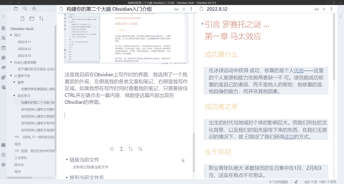 这是我目前在 Obsidian 上写作时的界面,我选用了一个我喜欢的外观,左侧是我的各类文章和笔记,右侧是我写作区域。如果我想在写作时同时查看我的笔记,只需要按住 CTRL 并左键点击一篇内容,就能使这篇内容出现在 Obsidian 的界面。
