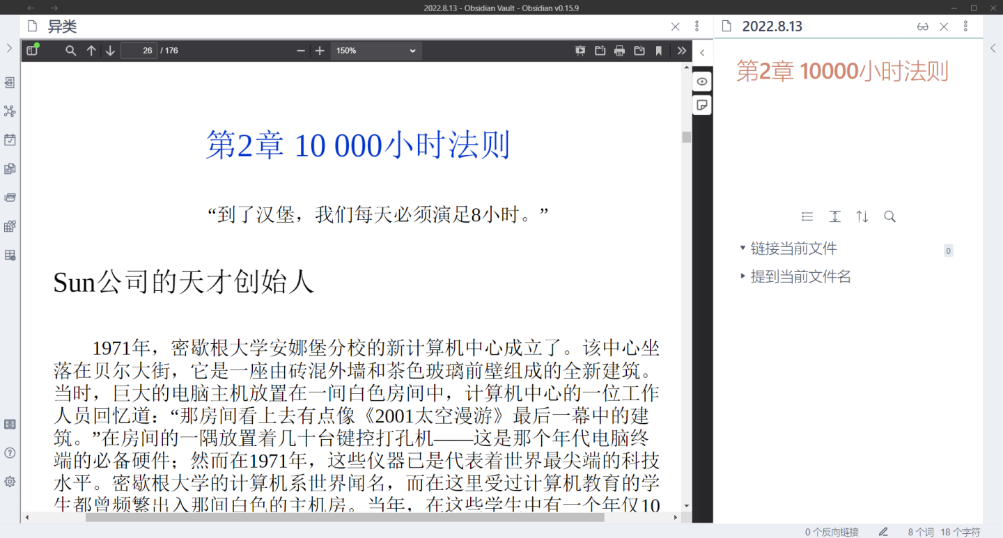 在使用 Obsidian 之前,我阅读使用 PDF 阅读器,做笔记使用幕布,Markdown 写作使用 Haroopad。可以说是每一个环节都处在非连接状态,写出来的文章和文章之间也不能创造相互之间的互动。