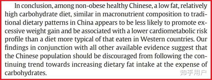 总的来说,在非肥胖的健康中国人中,低脂肪/相对高碳水化合物的传统饮食似乎不太可能促进体重过度增加,并且这种饮食与西方国家更典型的饮食相比,心脏代谢风险更低。