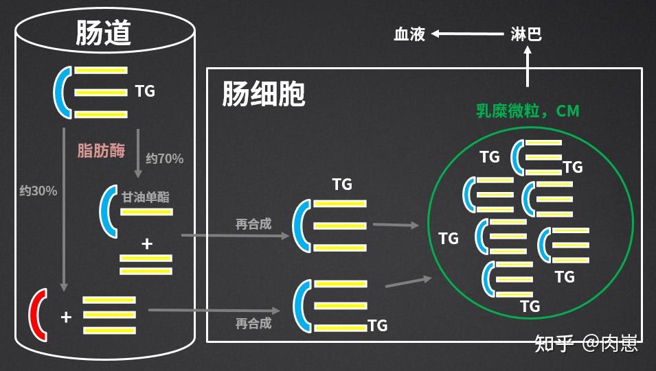 乳糜微粒中的TG还有一部分没有被完全水解,留在里面,连同逐渐变小的乳糜微粒一起成了残渣,被运往肝脏处理。相应的内容,我的另一篇文章有详细叙述: