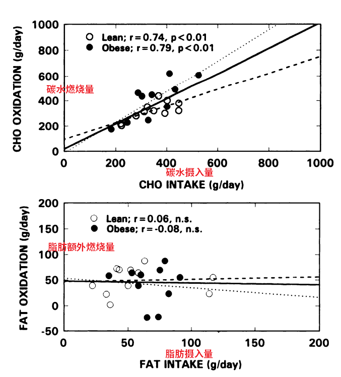 早期的研究已经证实了上述观点:34名非糖尿病男性经过了10天测试,前4天限制食物,从第5天开始让他们放开吃,这导致他们摄入过多总热量(32%-54%)。结果发现碳水化合物摄入增加导致了额外的碳水化合物氧化(燃烧),但脂肪摄入增加不导致额外脂肪氧化[87]。