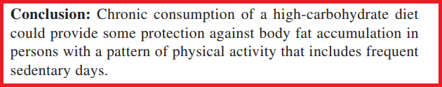 所以原文结论是,对于经常久坐的人来说,长期食用高碳水化合物饮食,对肥胖具有一定的保护作用。言下之意,吃高碳水也会长胖,但是比吃高脂肪稍微少长胖一些。