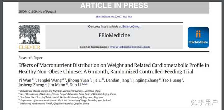 - ^Yi Wan,a,1 Fenglei Wang,a,1 Jihong Yuan,b Jie Li,b Dandan Jiang,b Jingjing Zhang,a Tao Huang,c Jusheng Zheng,a Jim Mann,d and Duo Lia,e.Effects of Macronutrient Distribution on Weight and Related Cardiometabolic Profile in Healthy Non-Obese Chinese: A 6-month, Randomized Controlled-Feeding Trial.EBioMedicine. 2017 Aug; 22: 200–207.