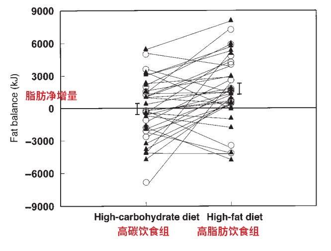 这个研究让35名正常和肥胖的受试者随机分配到持续15天【同等热量】的高碳水化合物(55%碳水)或高脂肪(50%脂肪)饮食中,在前14天,调整了饮食量,保持他们的体重不变。第15天受试者在代谢房中静坐呆23小时,并吃了【同等热量的】超量饮食,结果是高脂肪组长了更多体脂。