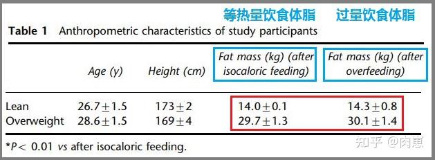 4周后,精瘦的受试者体脂从14kg变成14.3kg,增加了0.3kg脂肪;肥胖/超重的受试者体脂从29.7kg变成30.1kg,增加了0.4kg脂肪(平均值,不看标准差)。