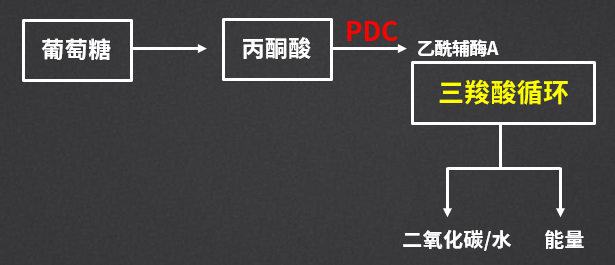 这涉及一种关键的酶:丙酮酸脱氢酶复合物-PDC[90][91]。人和动植物获得能量,主要靠著名的三羧酸循环(也叫柠檬酸循环、TCA循环、Kreb循环)。PDC就是那个促进丙酮酸转乙酰辅酶A[92]、促进葡萄糖燃烧的关键酶[93][94]。